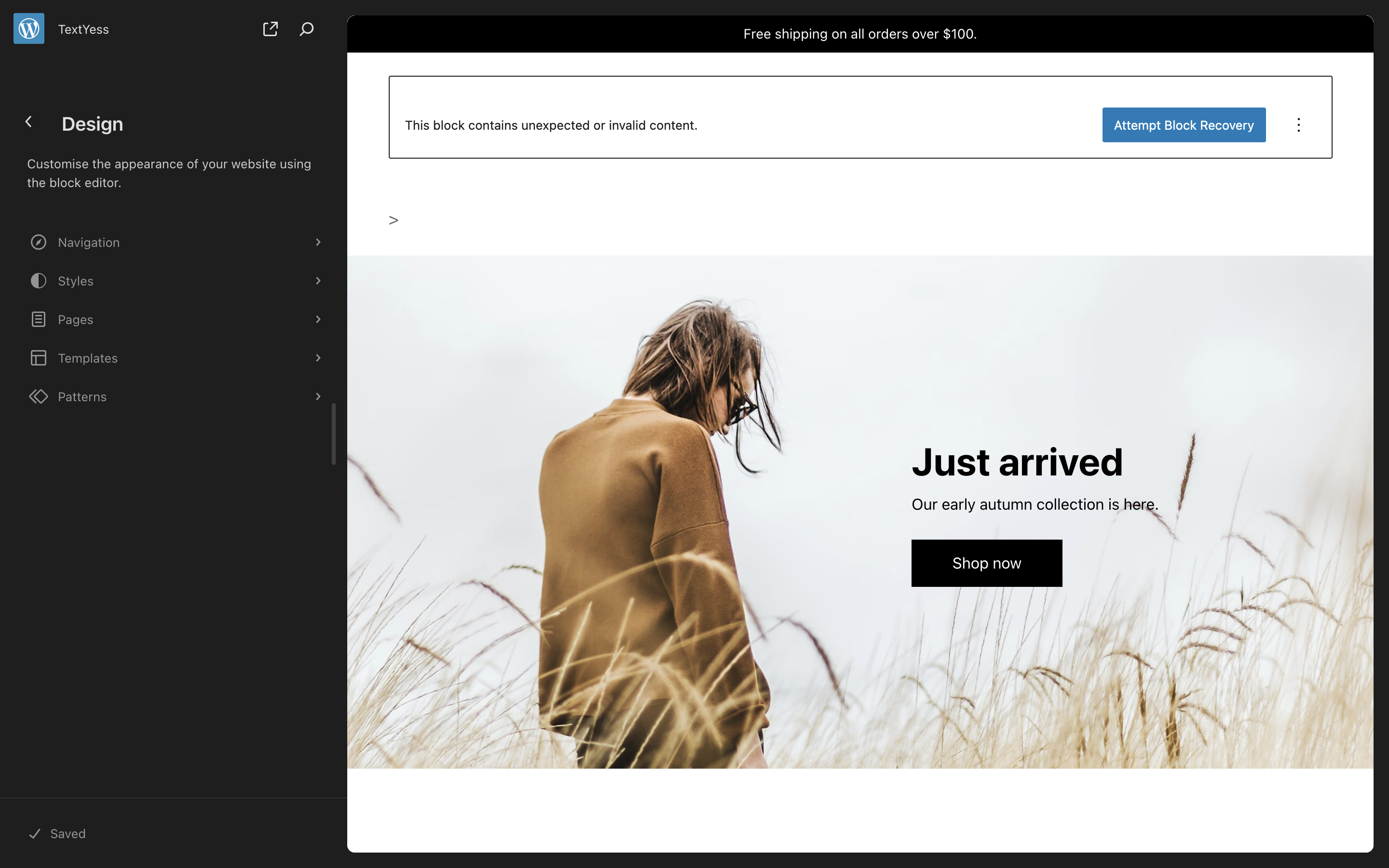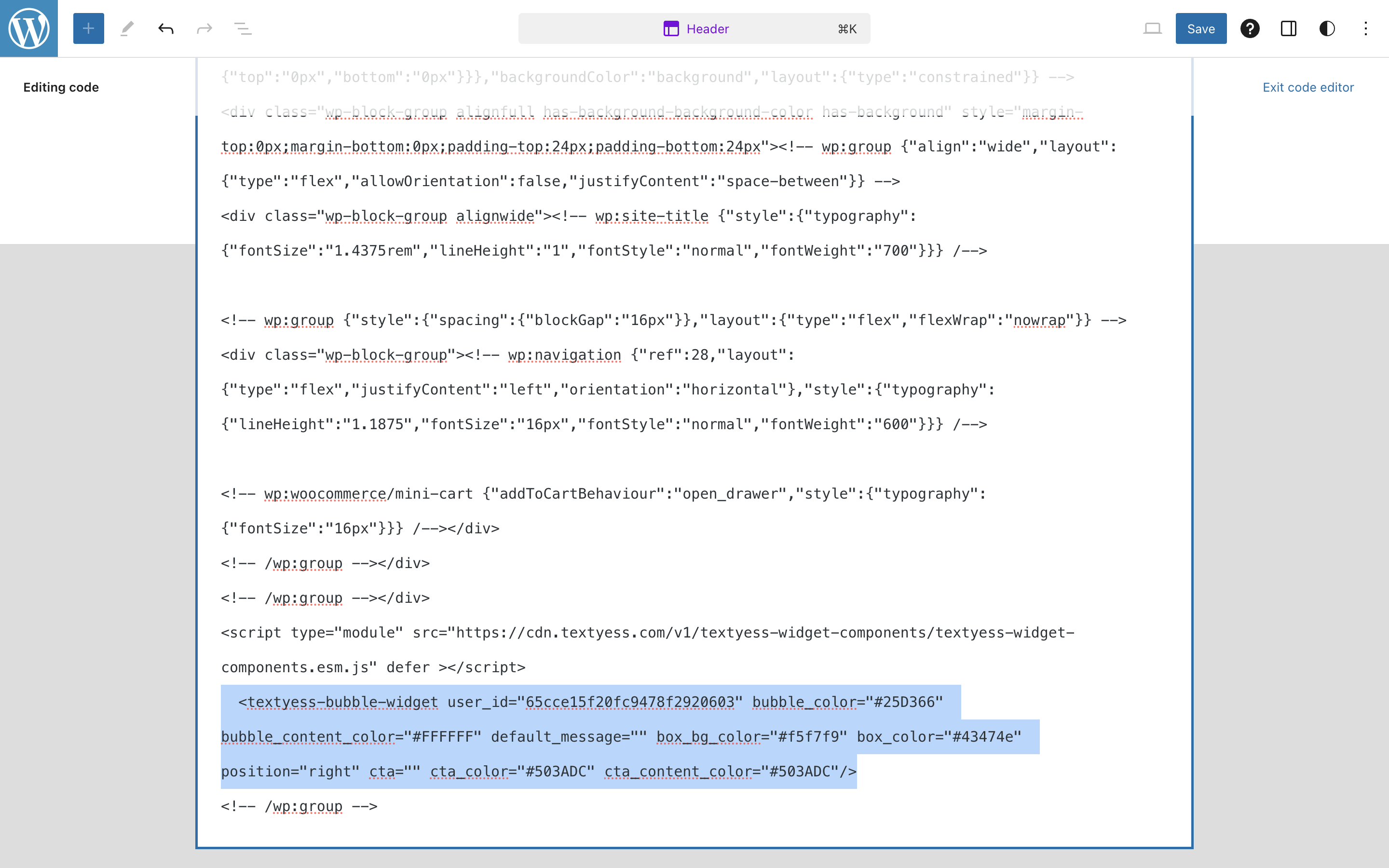 <textyess-ai-widget> tag, which is different from the WhatsApp bubble widget (<textyess-bubble-widget>).Go to Appearance > Editor