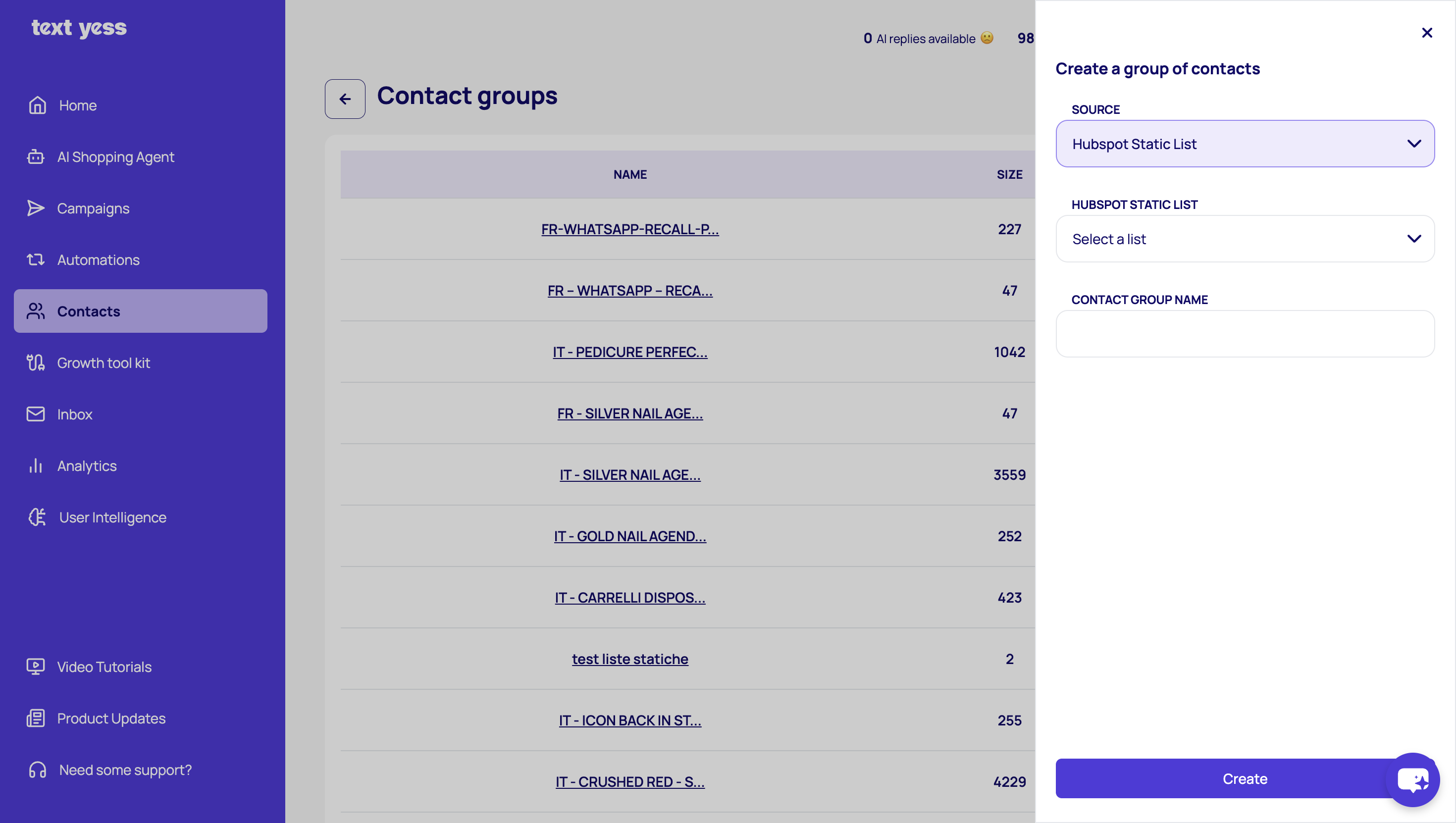 From the source drop-down menu, select Hubspot Static List, then choose the list you want to import. Enter a name for your contact group and click “Create”. The group will be automatically created in TextYess and populated with the selected contacts.