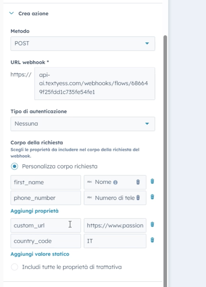Next, switch to Hubspot and go to workflows, where you can add the webhook either to an existing flow or create a new one. Paste the destination URL you copied from TextYess into URL webhook in Hubspot, and then fill in the keys and properties as shown in the image below.