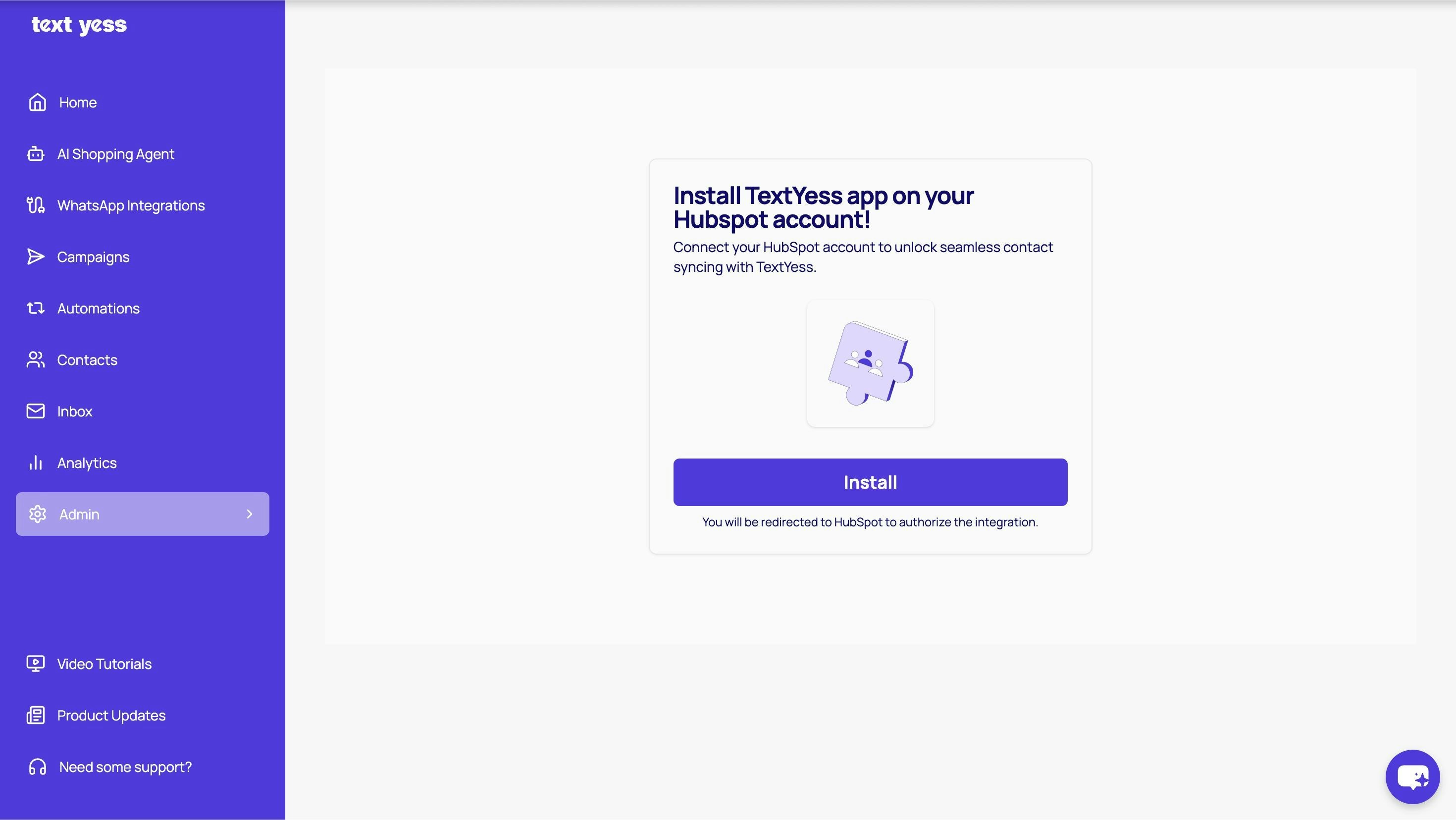 The first step is to install your TextYess account into Hubspot at the following page. You’ll click on “Install” and will be redirected to Hubspot to authorize the integration.