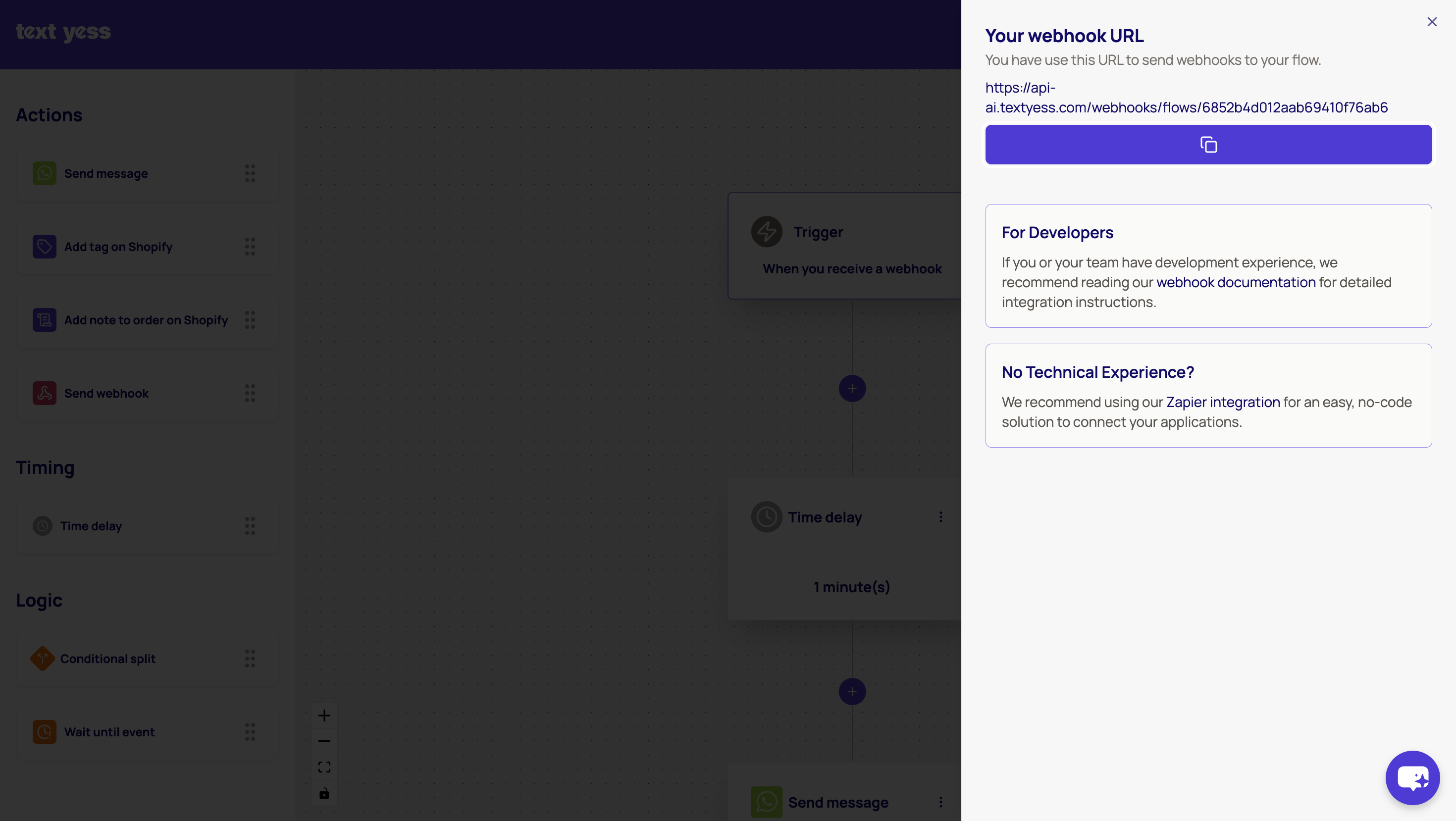 In TextYess, go to Automations and click on Create. Set the trigger to Webhook, and you will see a URL in the trigger settings that you need to copy.