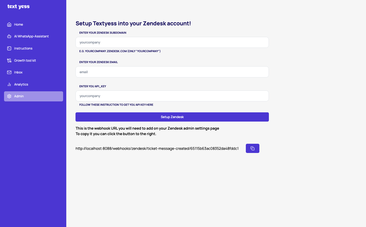 The first step is to connect your Zendesk account to TextYess.Open the Zendesk Integration page inside TextYess by navigating to https://ai.textyess.com/integrations/zendesk.