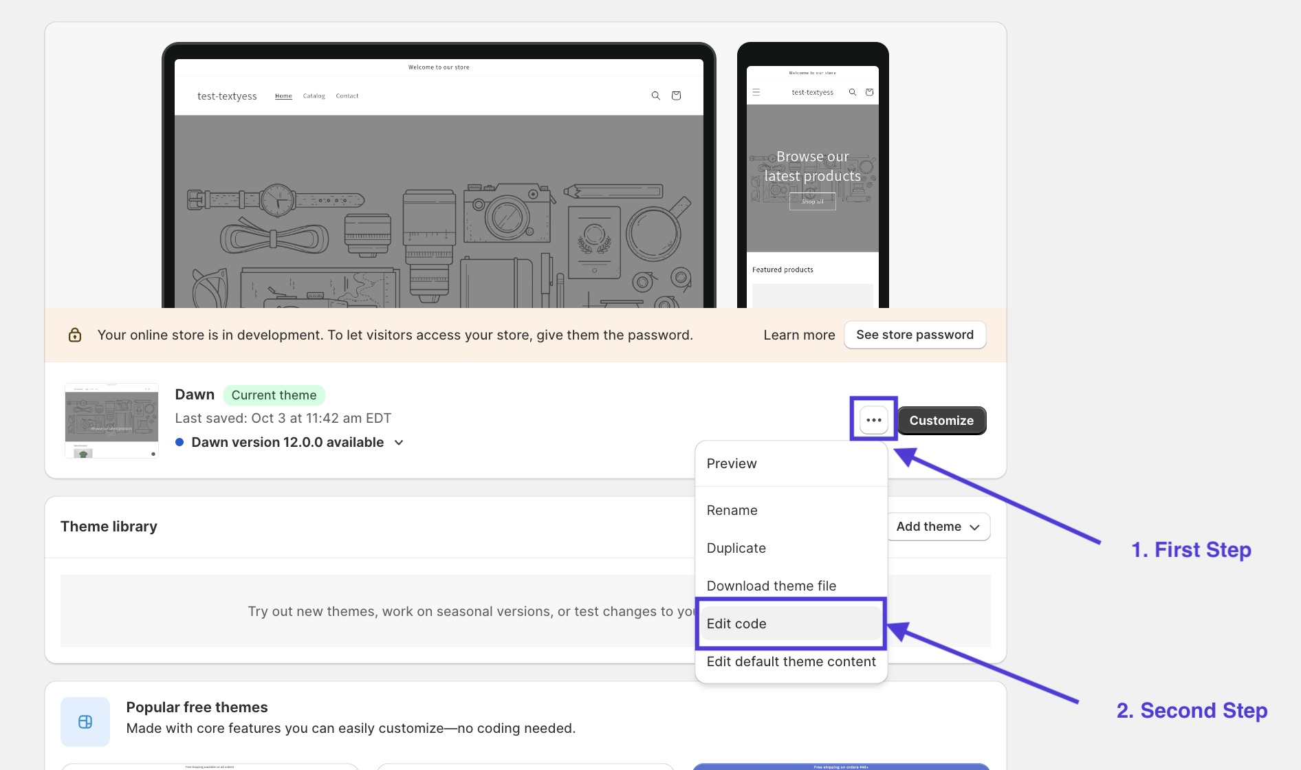Opening the theme editor is very simple. Just click on the three dots of the theme you want to update. Then click on “Edit code”.