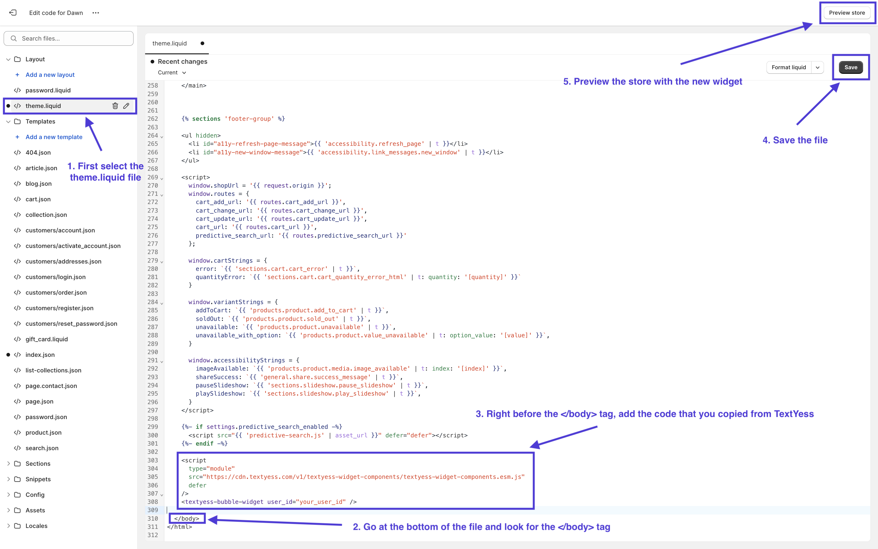 </body> tag Once you find the tag, paste the code snippet you generated from TextYess (see step “Get the code snippet”) right before the the